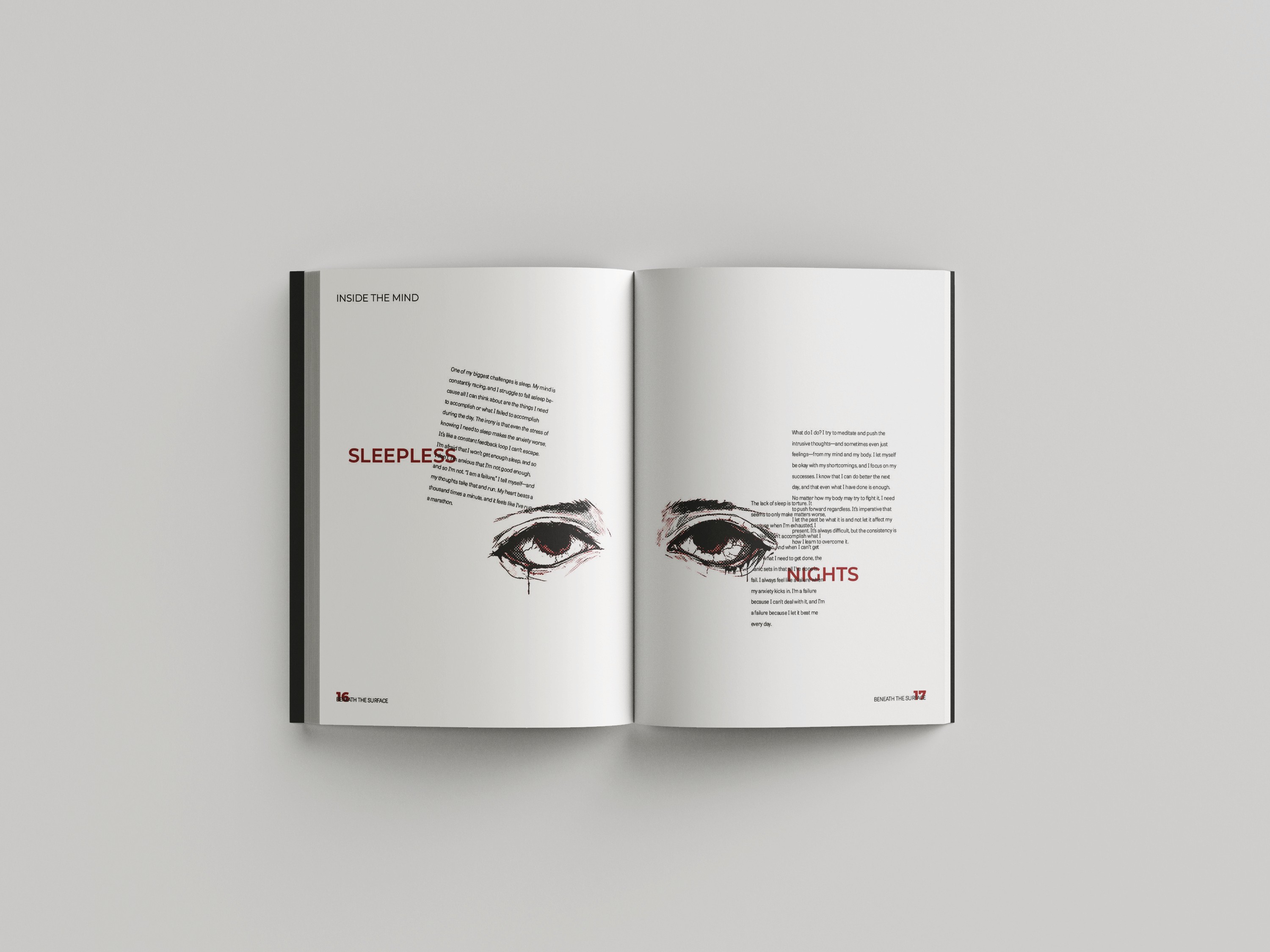 This layout design explores various mental illnesses and their personal impact on those who experience them. Rather than relying on generic medical definitions, the project involved interviewing individuals to convey their feelings and experiences. Through intentional layout and art direction choices, the intent was to help viewers empathize and connect with the emotional realities of mental health struggles.