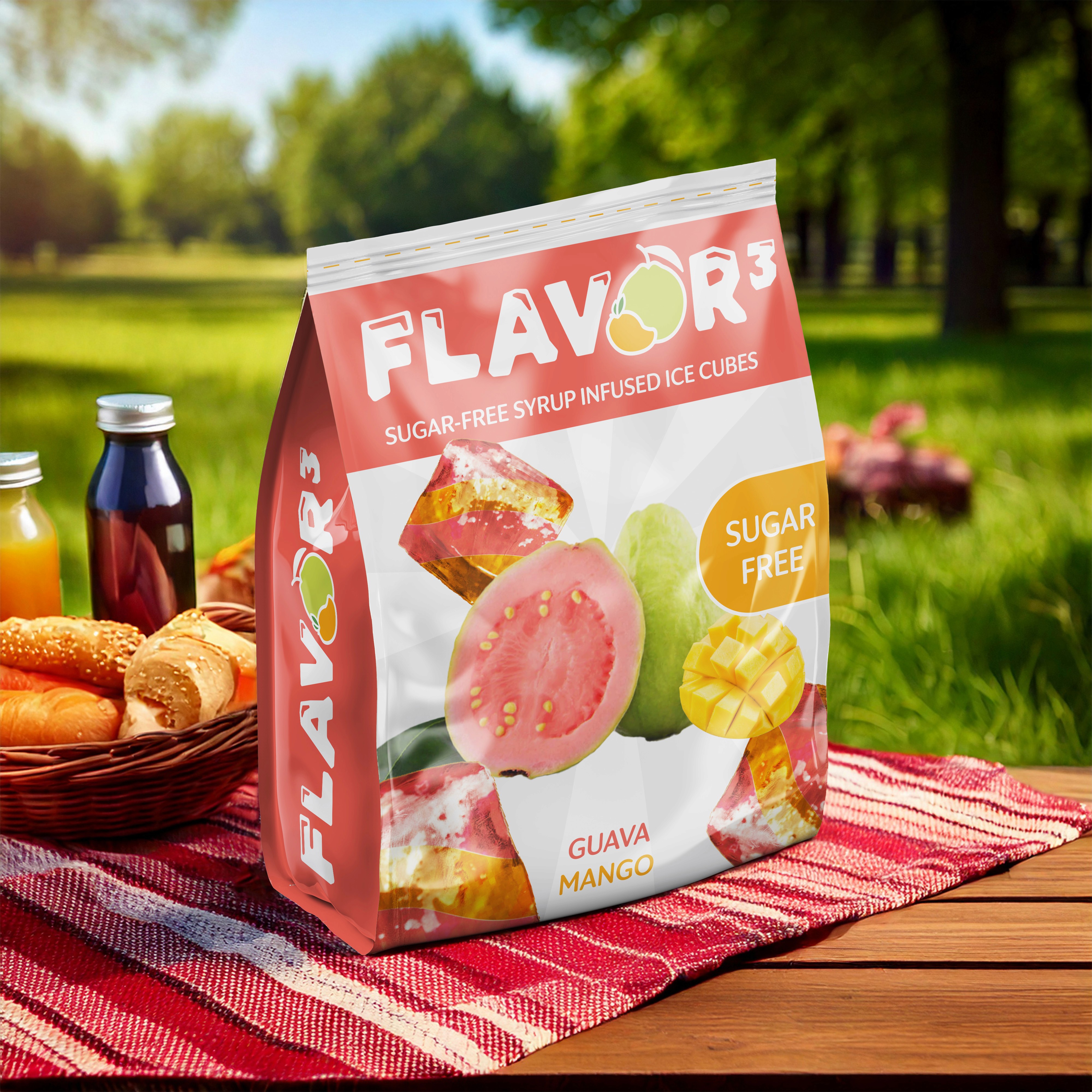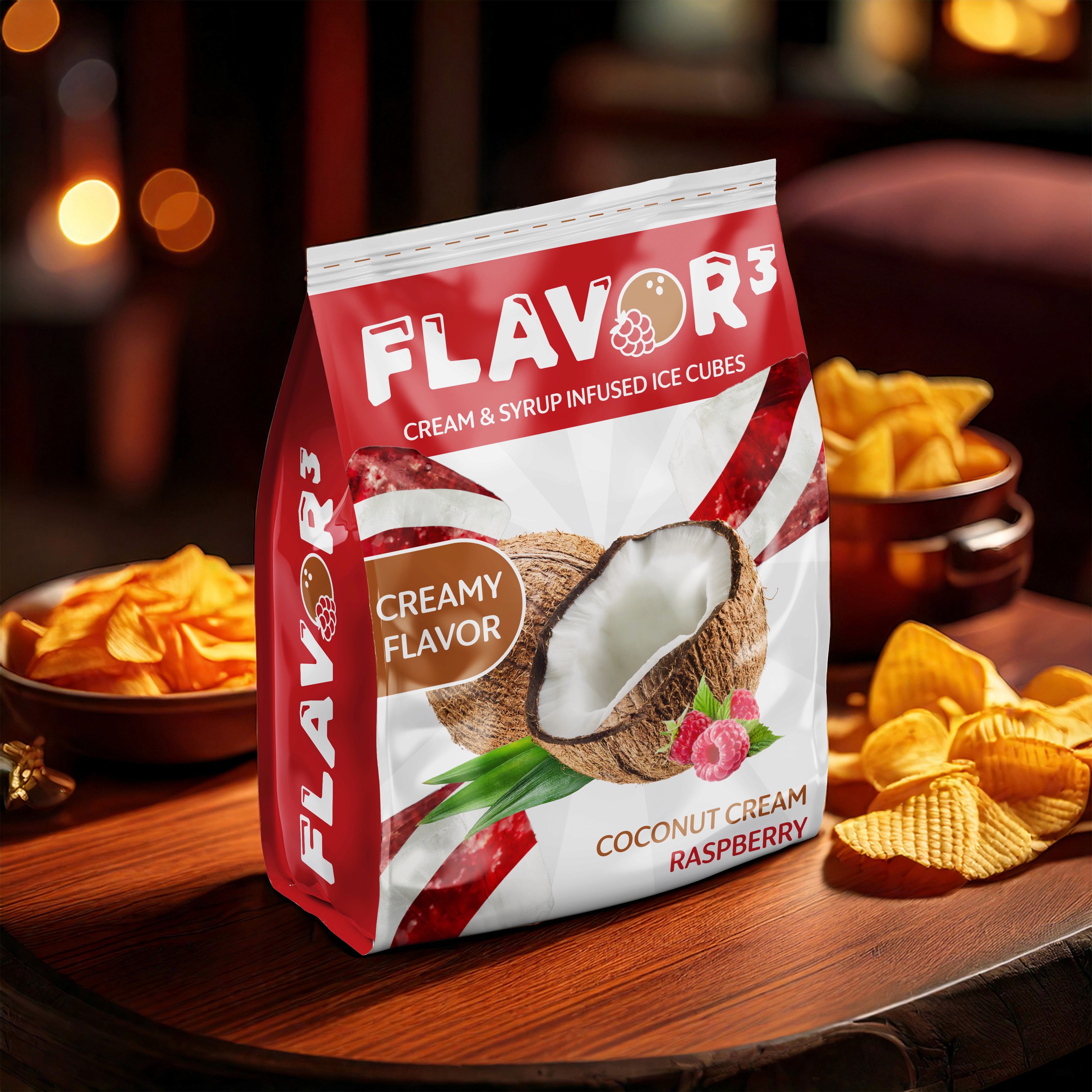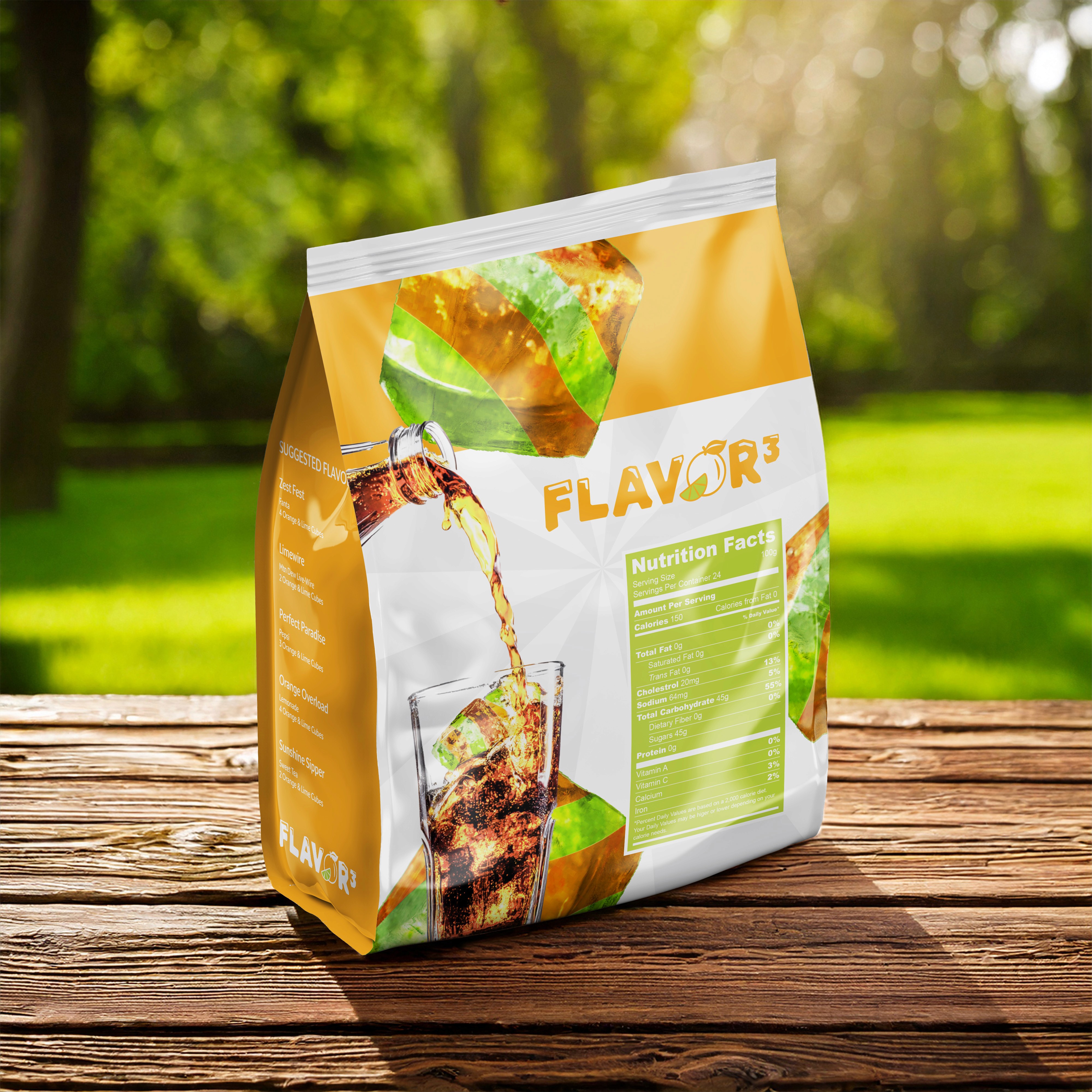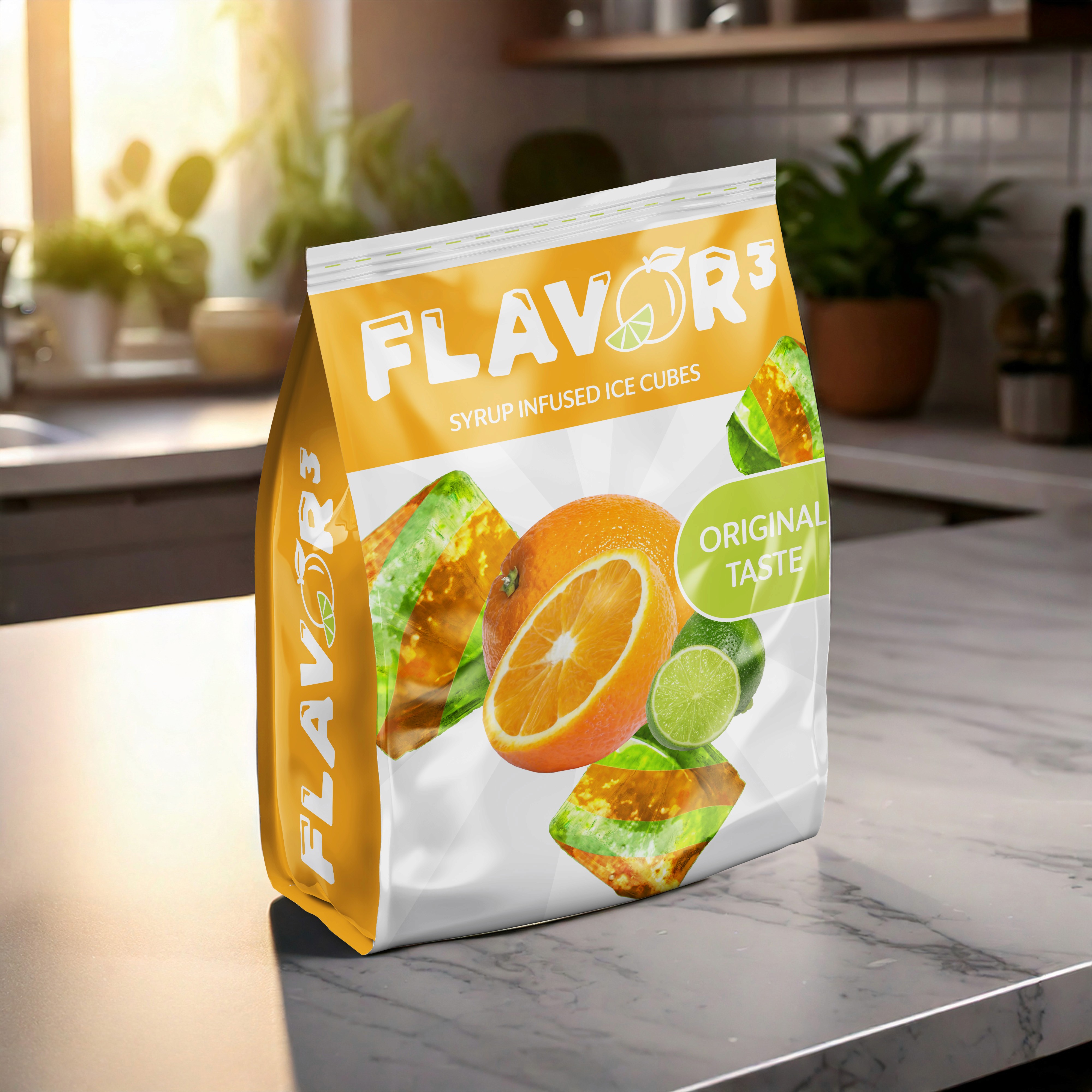 A conceptual design for Flavor Cubed, a flavored ice cube brand meant to enhance beverages with playful, layered flavors.