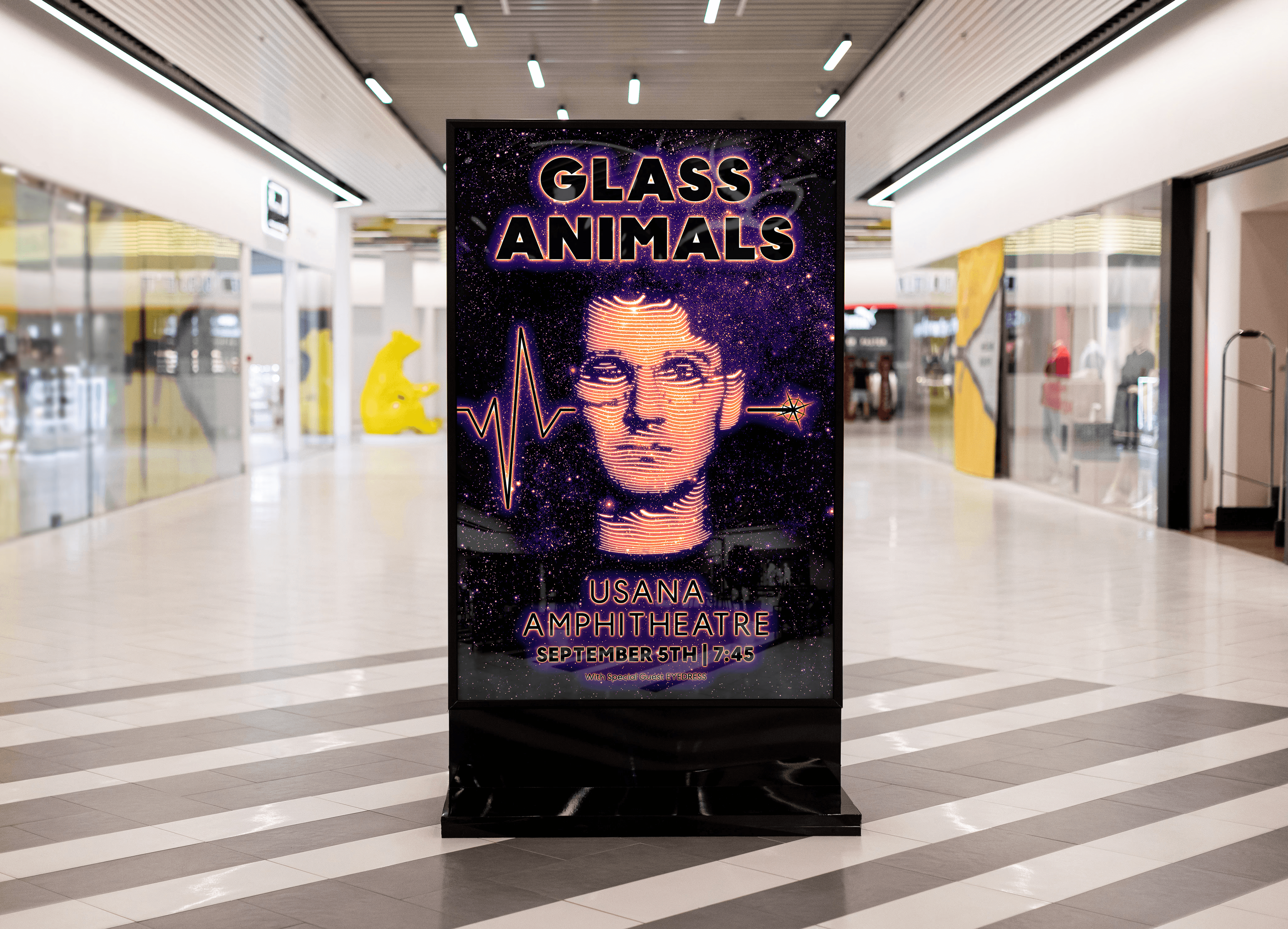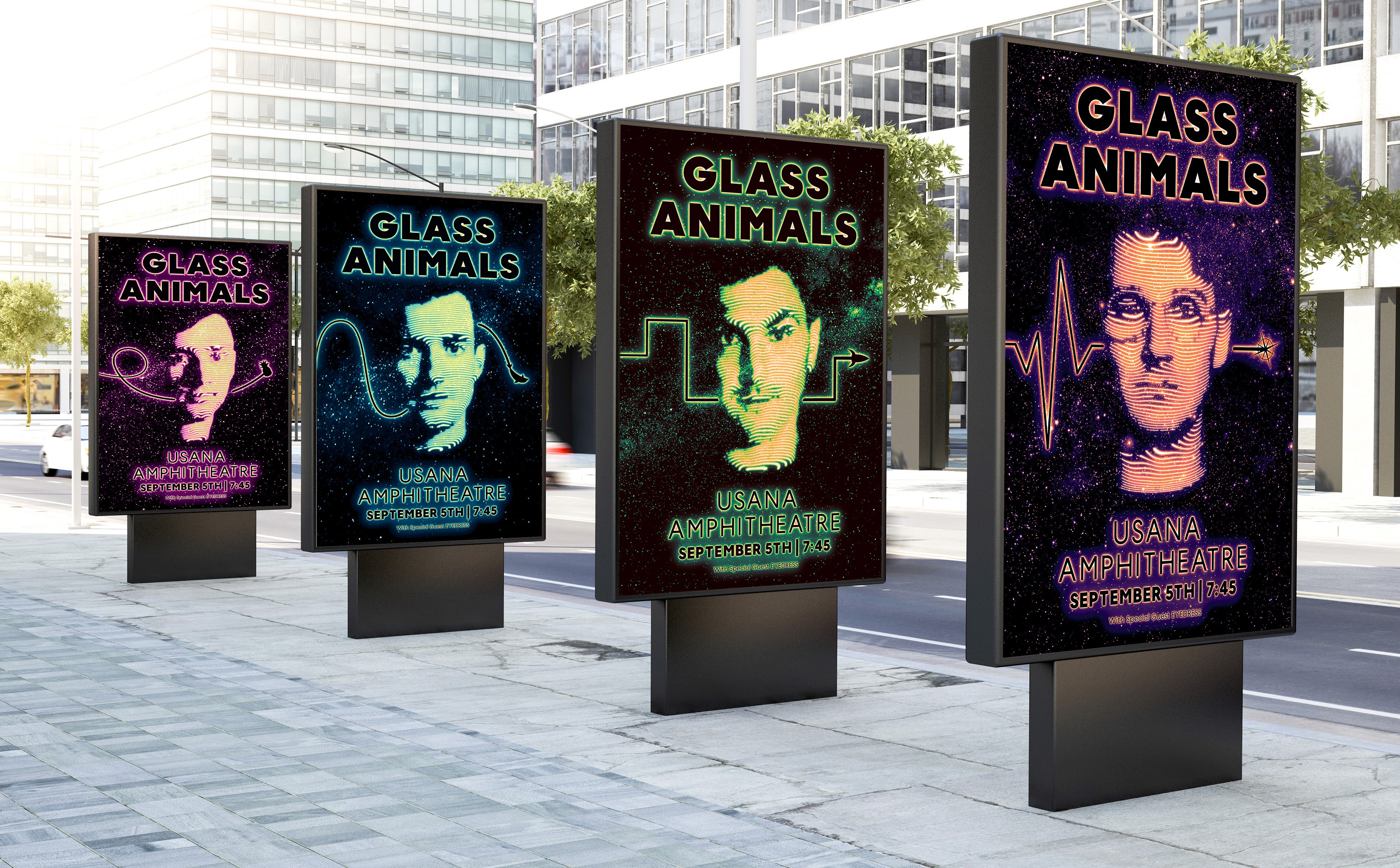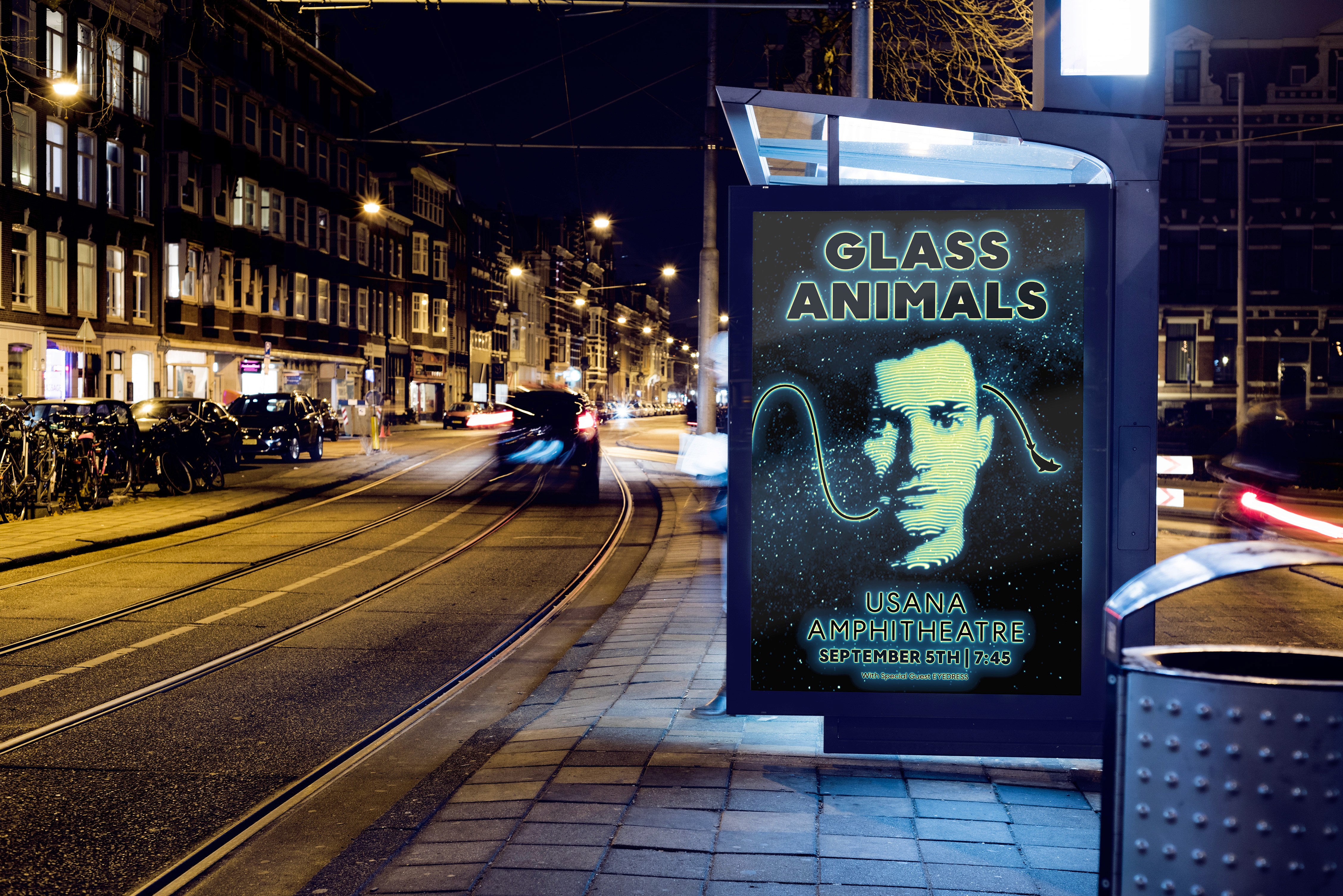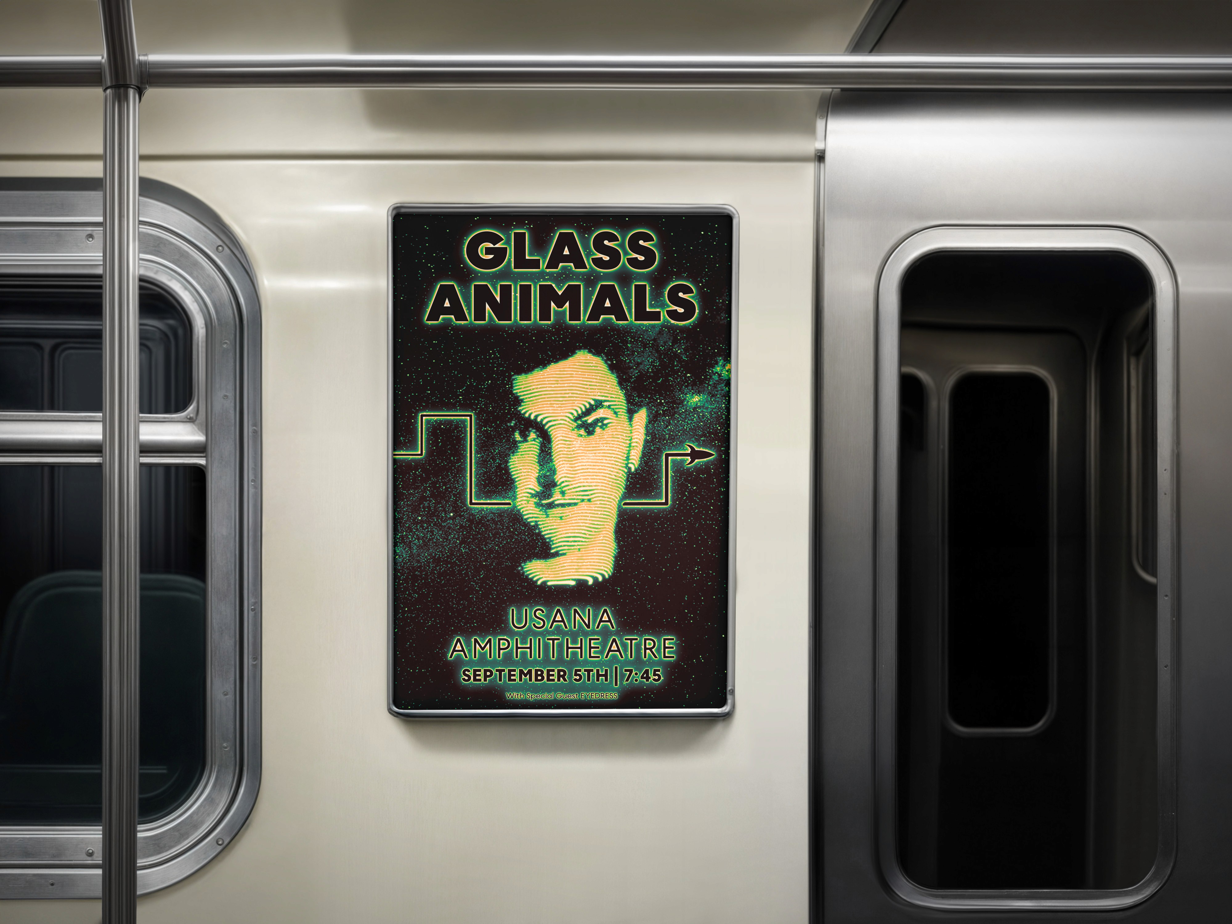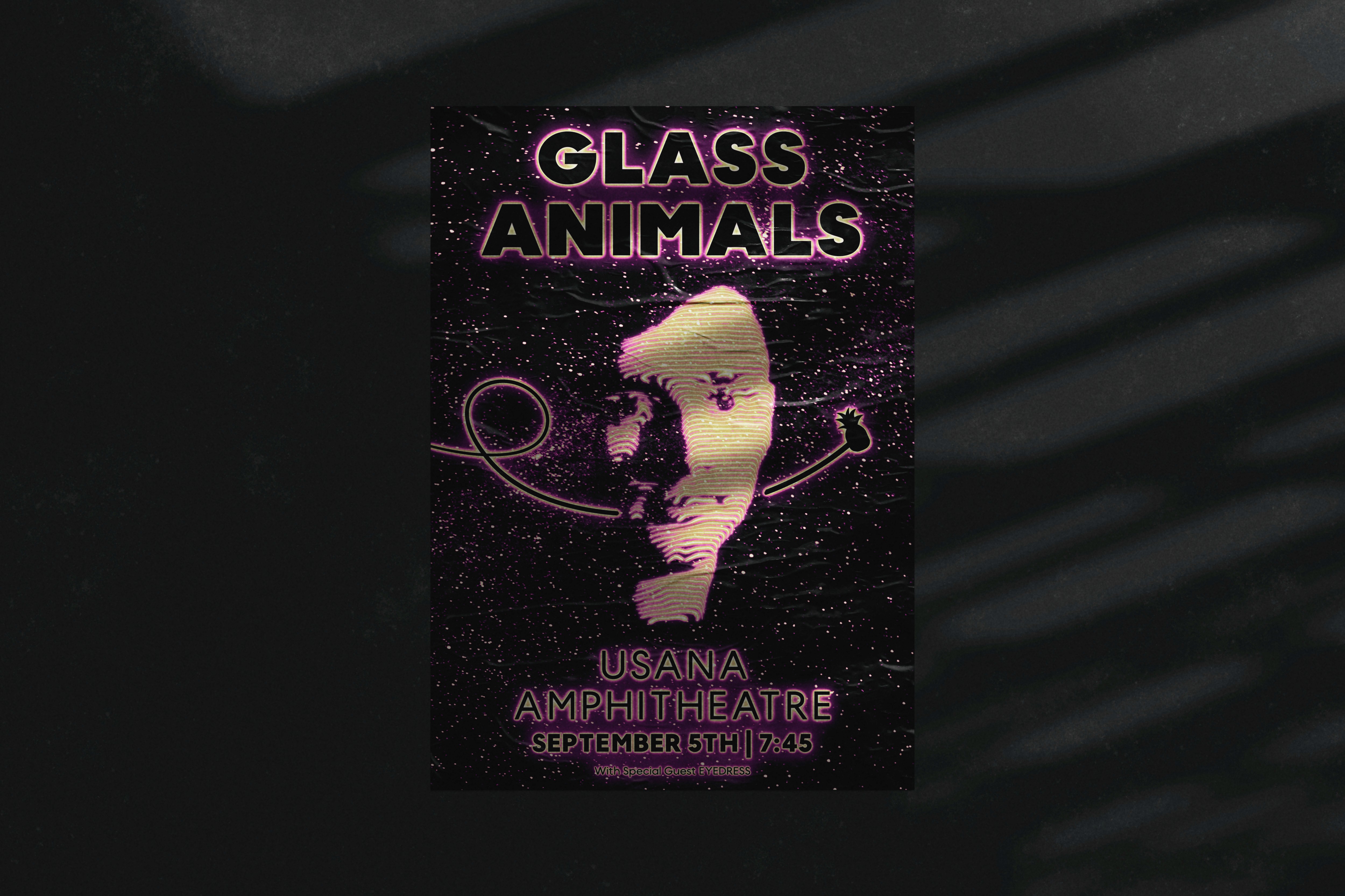 This poster design was created conceptually for Glass Animals’ Tour of Earth concert in Utah in 2024. It incorporates visual elements inspired by their songs, hidden easter-eggs related to the band, and references to pop culture, including nods to "The Hitchhiker’s Guide to the Galaxy", which majorly influenced the album.