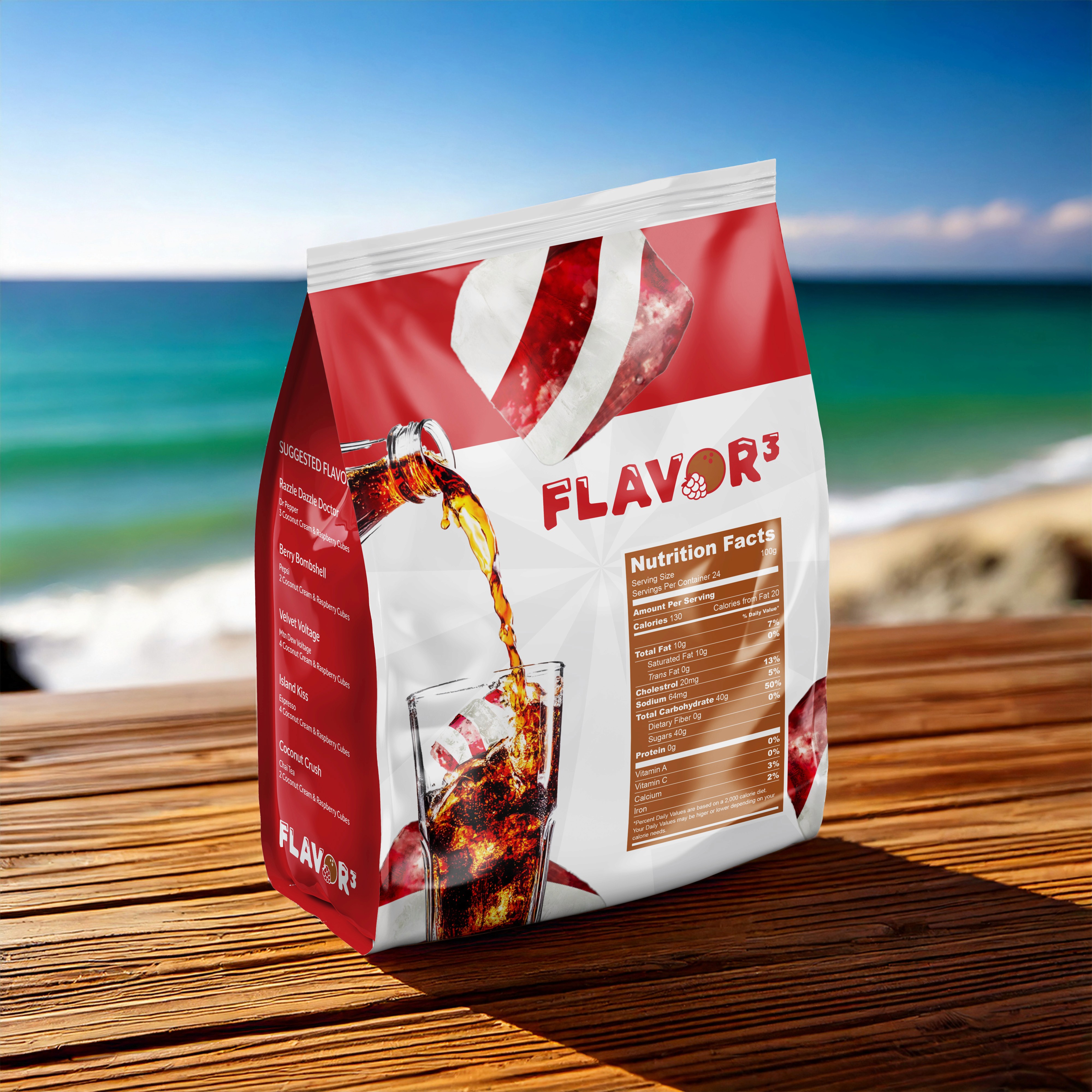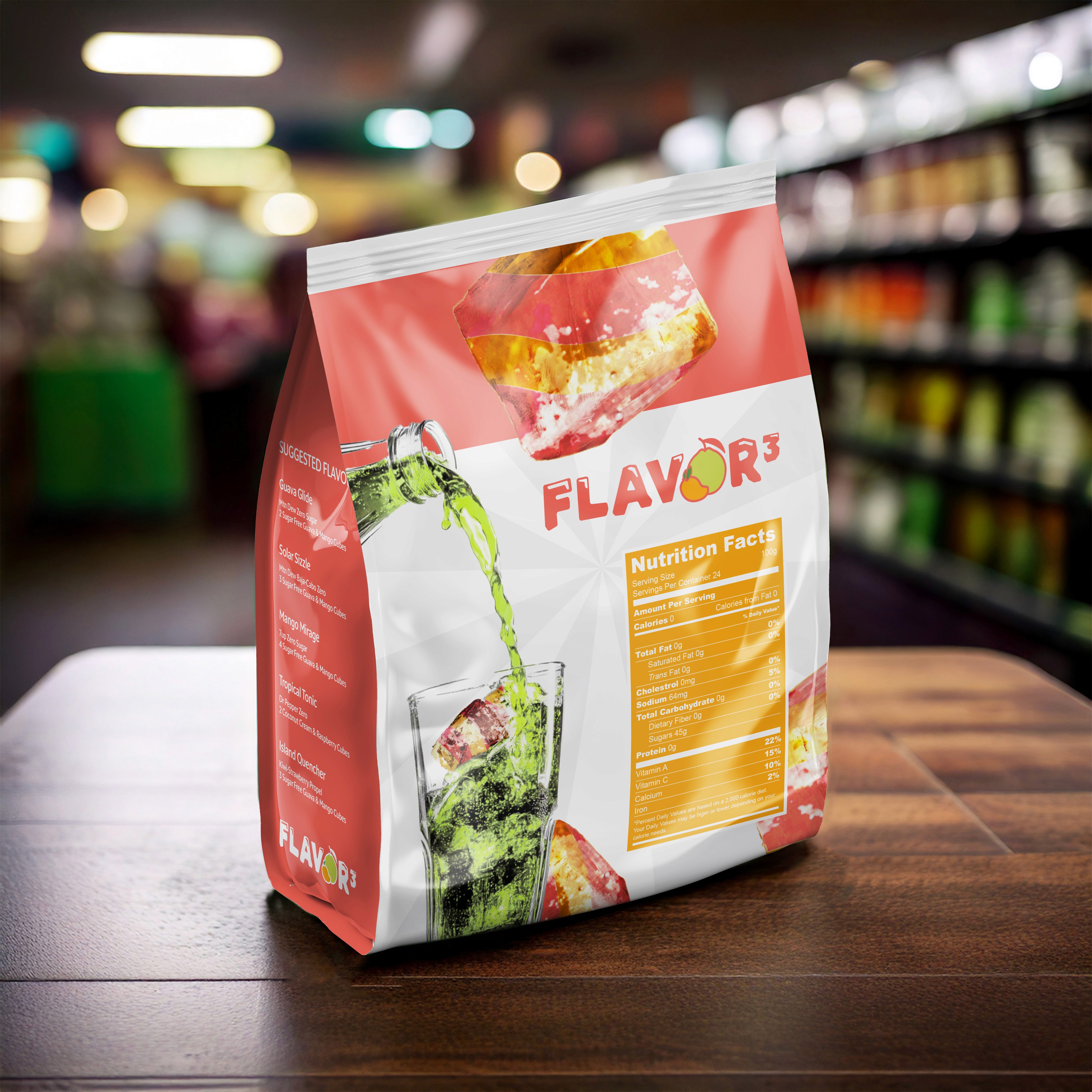 This project is a conceptual design for a flavored ice cube brand called Flavor Cubed. The product is intended to be added to beverages such as coffee or soda, enhancing them with layered flavors. The name plays on the idea of exponential flavor while also making a playful reference to the ice cube format.