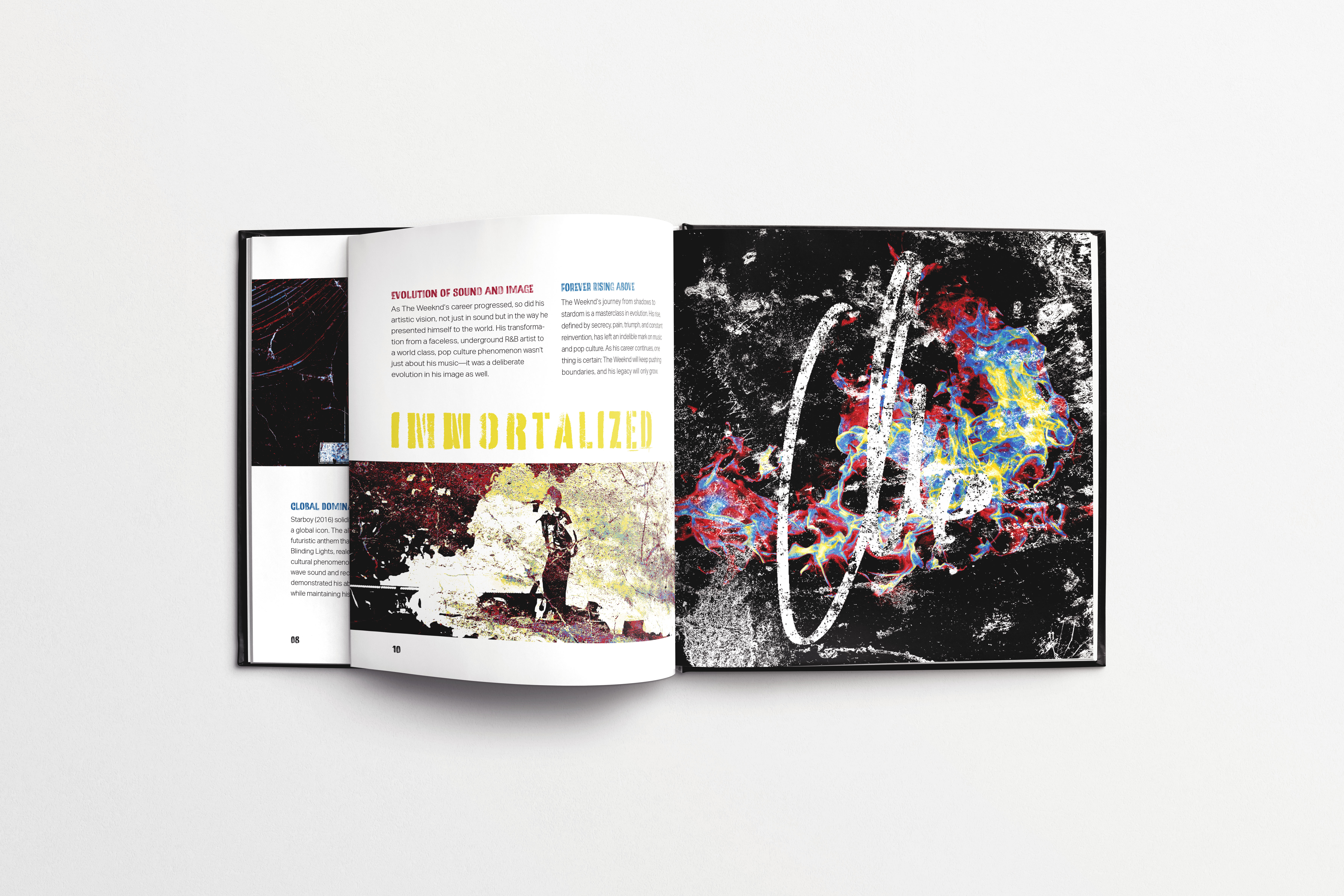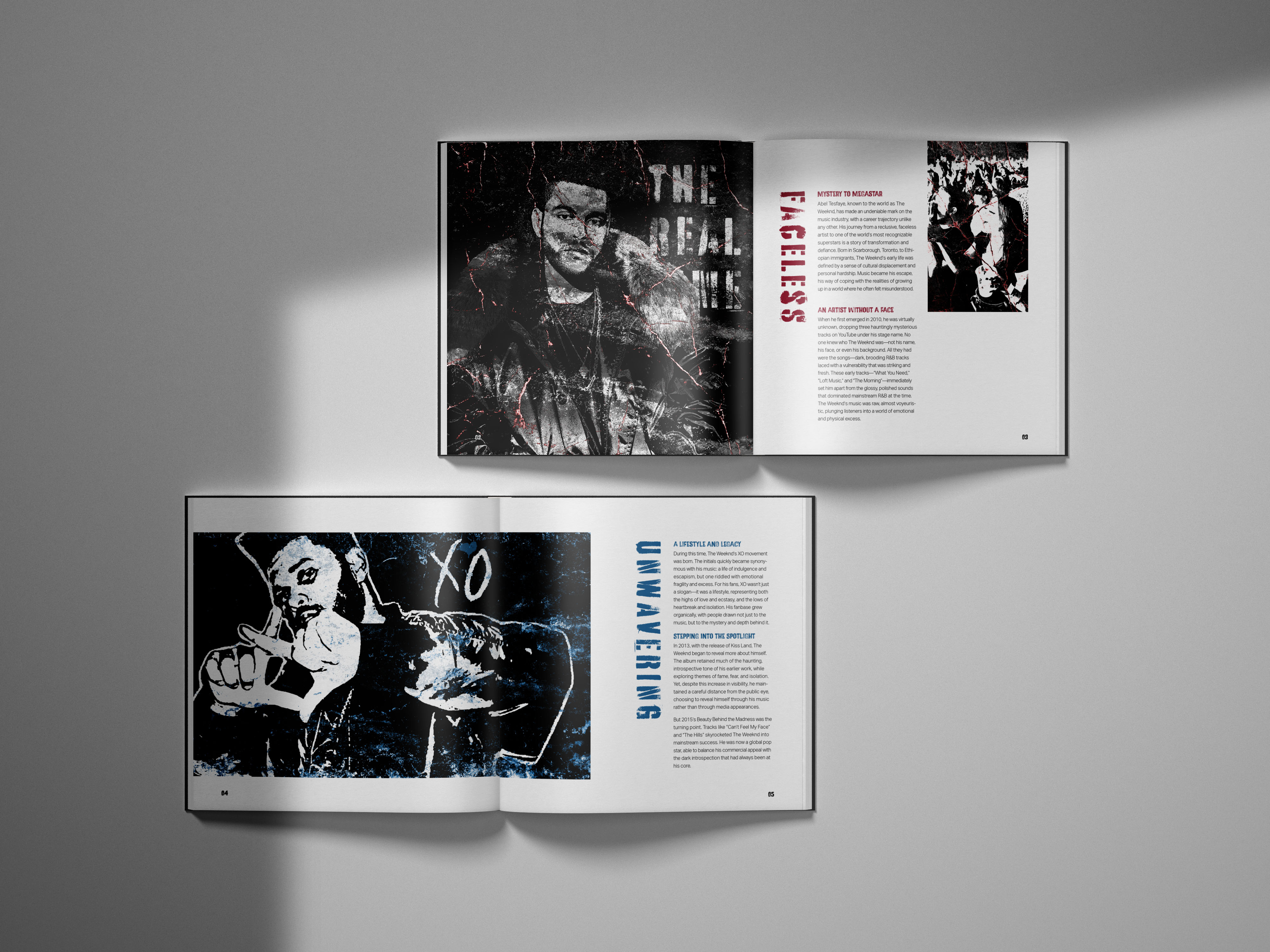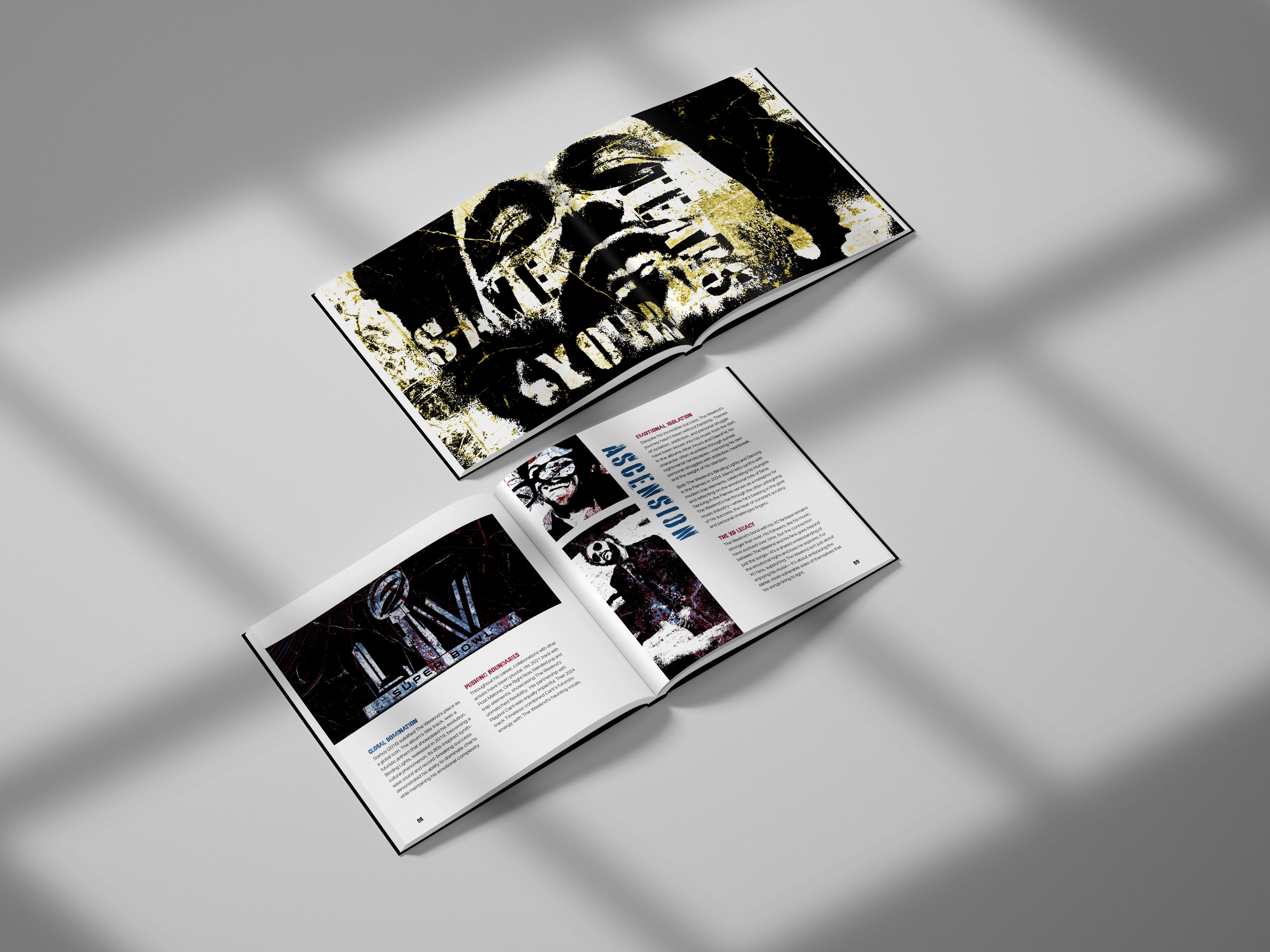 "From Shadows to Stardom" is a layout design exploring the musical evolution of The Weeknd. The project traces his journey from mysterious R&B beginnings to mainstream pop success, showing how this transition propelled him into international fame. The design uses primary colors strategically, gradually layering them from the start to the end of the layout to visually symbolize his shift to pop and the lasting impact of his signature sound.