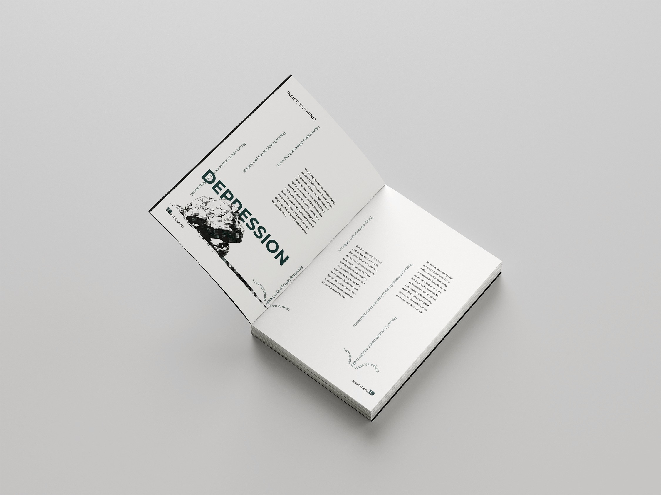 This layout design conveys personal experiences of mental illness through interviews, using immersive art and layout choices.