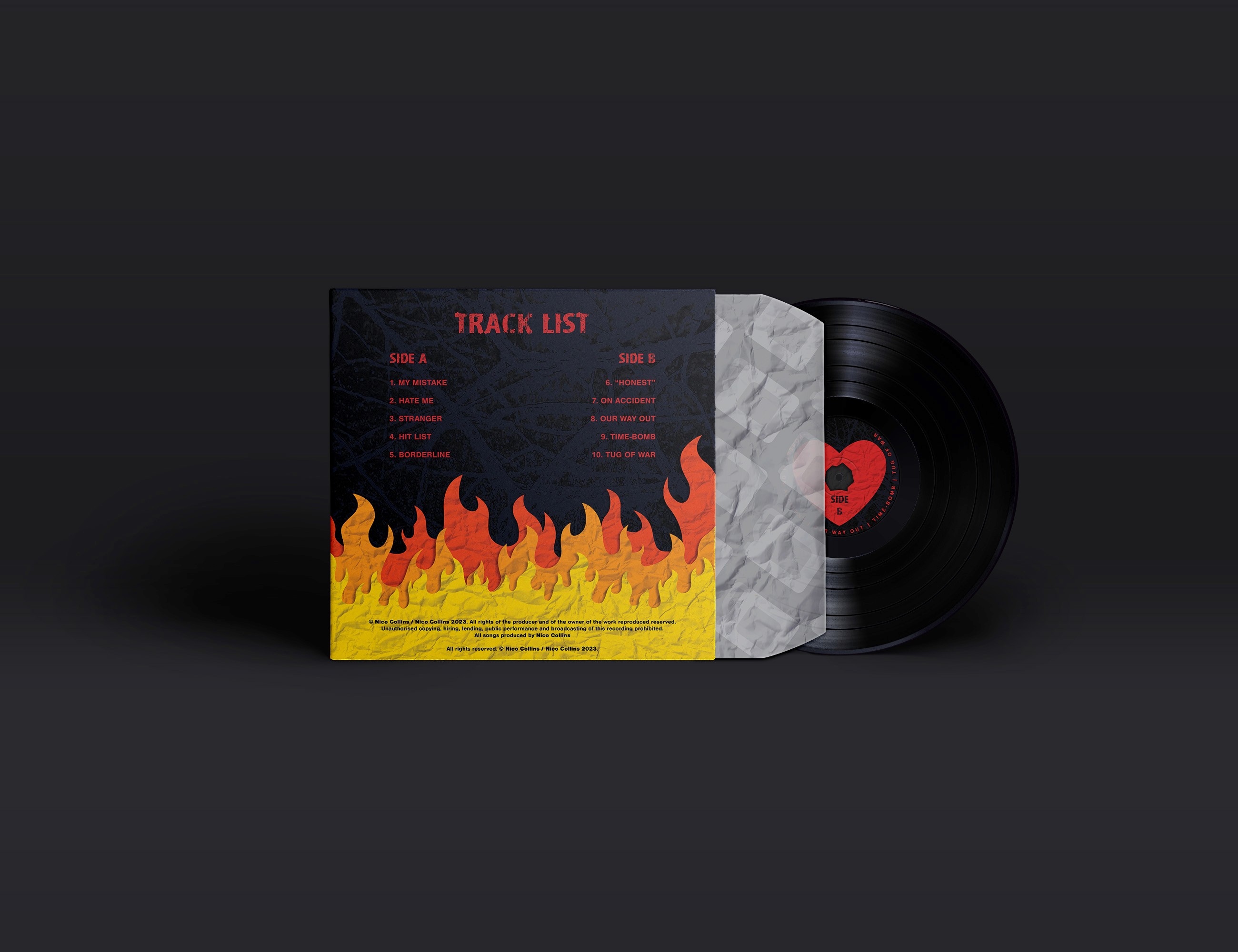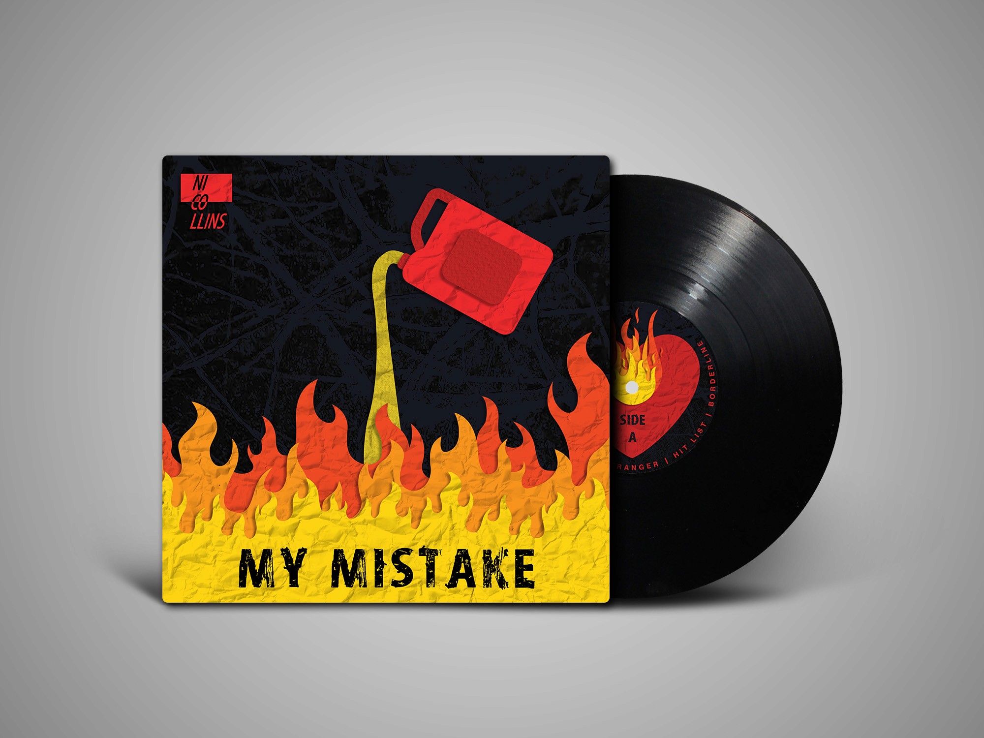 This album cover was designed for Nico Collins for his song "My Mistake." The design focuses on a key lyric, “you put out your fires with gasoline,” to create the main composition. A paper collage effect symbolizes the fragility of a burning relationship, while the words “My Mistake” are placed within the flames to reflect the message of the song, that he allowed it to continue.